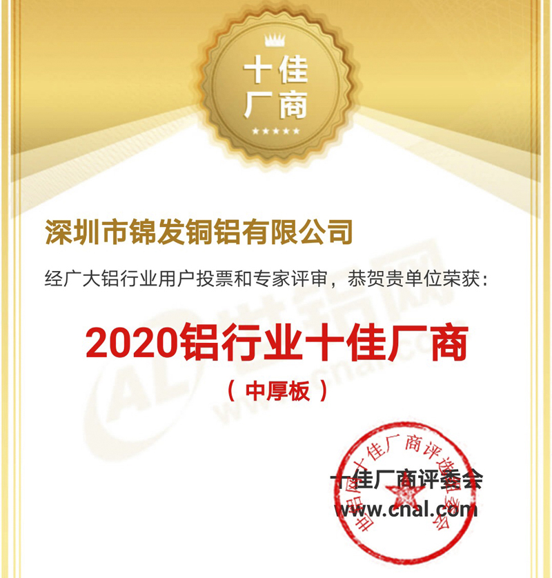 2020年4月份,世鋁網舉辦了“2020鋁行業十佳廠商評選”,在眾多專家、客戶和合作伙伴鼎力支持下,錦發銅鋁高票當選“中厚板”類第一名! 這也是錦發銅鋁連續三年獲得榮譽!